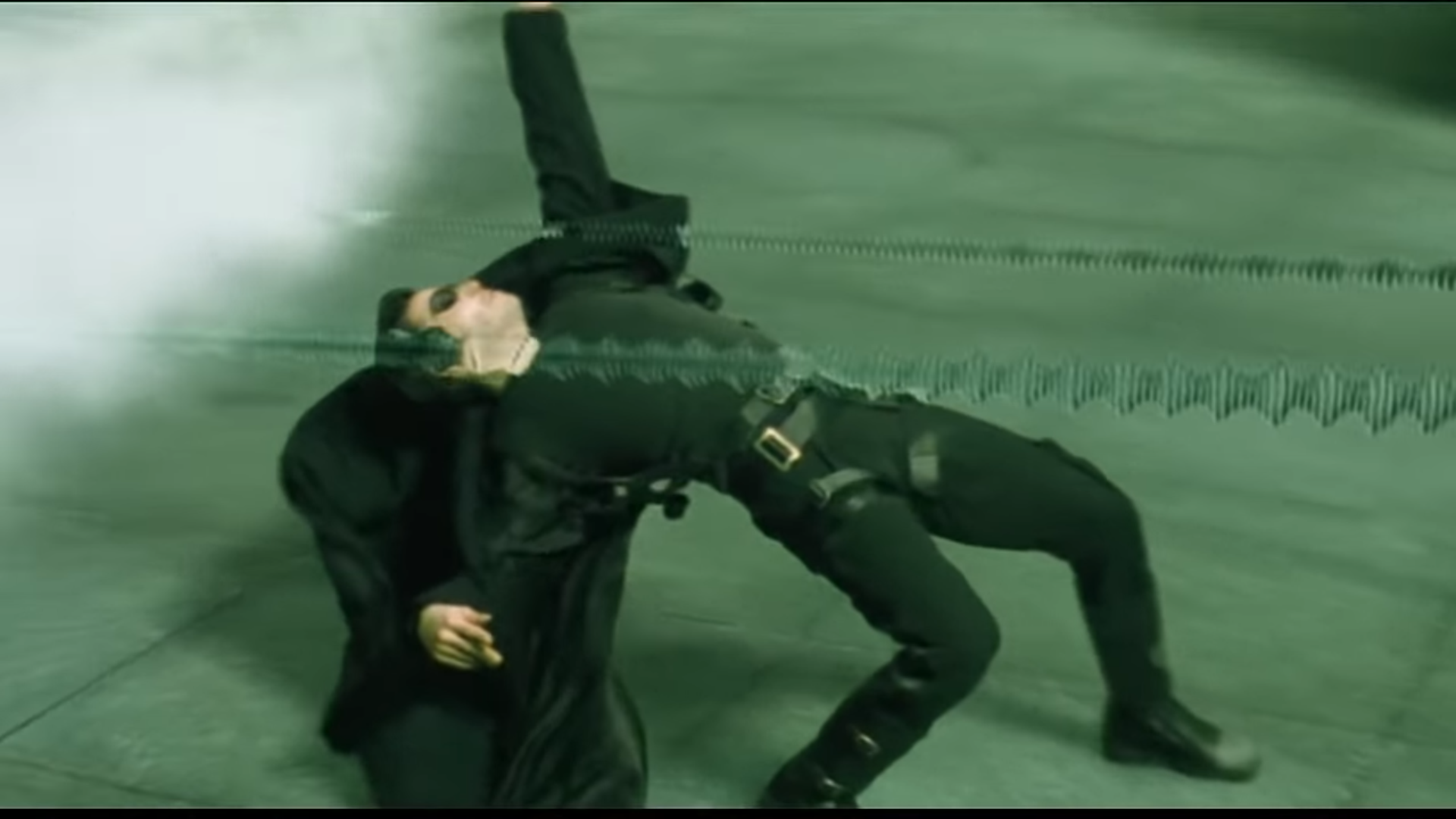 Neo, pur essendo bloccata dal bullet time prodotto dall’Analista, cerca di correre verso Trinity per salvarla.
